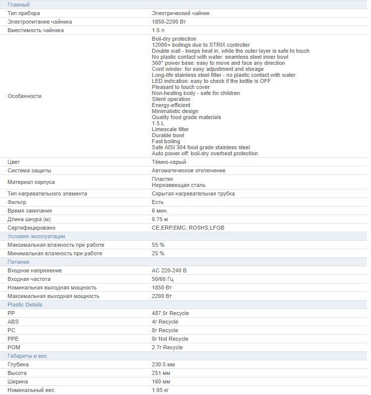Индикация включения-есть; Индикация уровня воды – есть (внутренняя); Блокировка включения без воды – есть; Особенность - автоматическое отключение